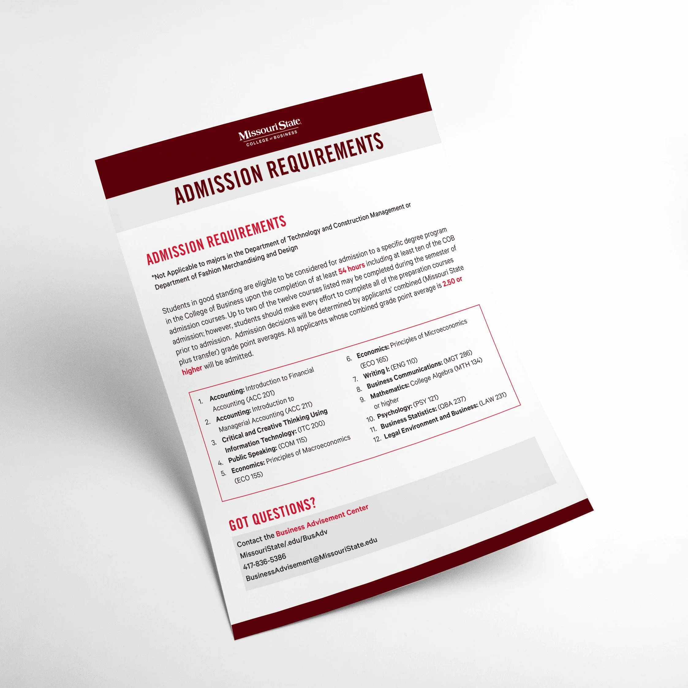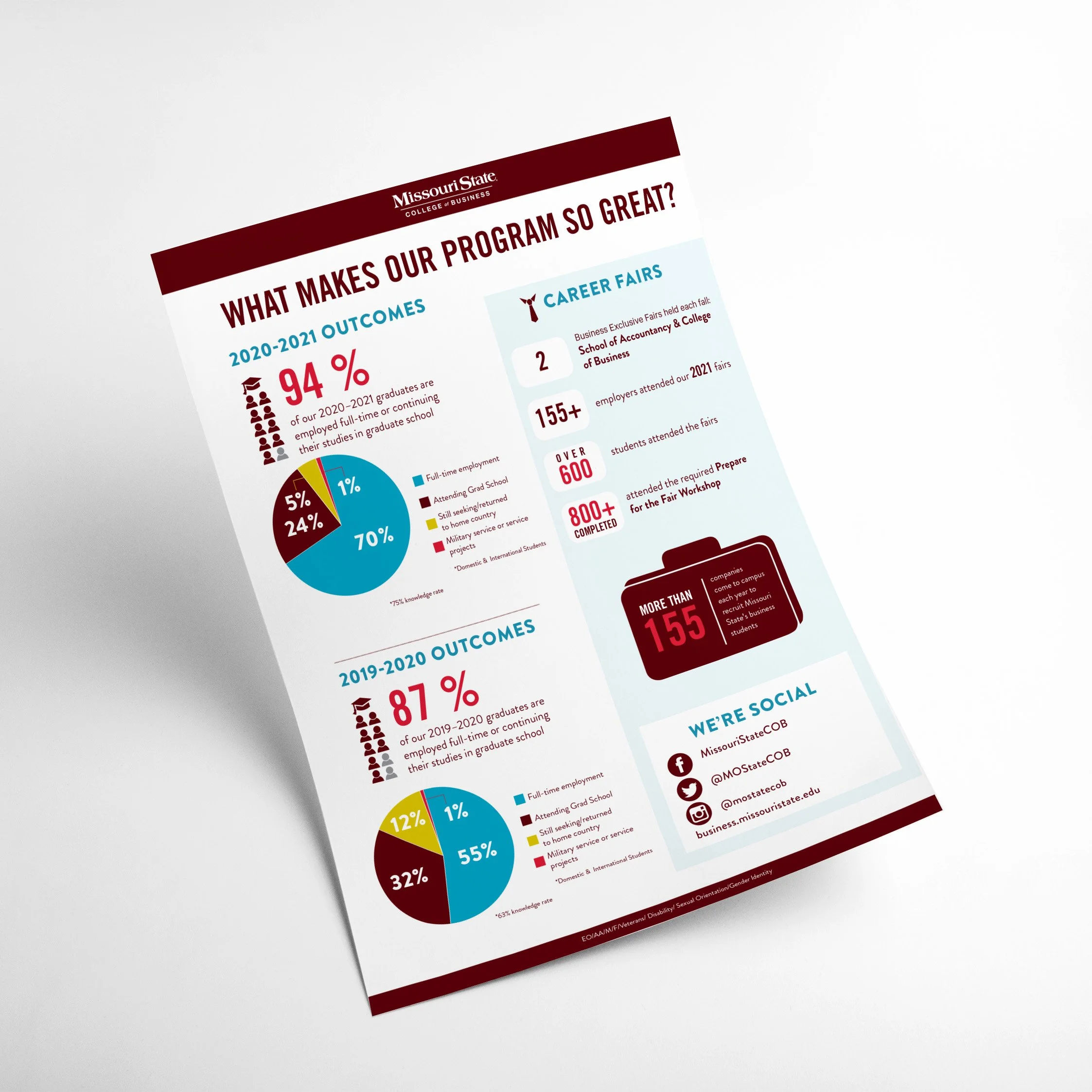While working at The College of Business at Missouri State University, I created many things ranging from pamphlets and staff directories to social media graphics and promotional merchandise. The main focus when I was creating these was making sure I established The College of Business's main goal: to educate and persuade future and current students why they should choose to study within The College of Business and what are the benefits. These are only a few examples of my work created.