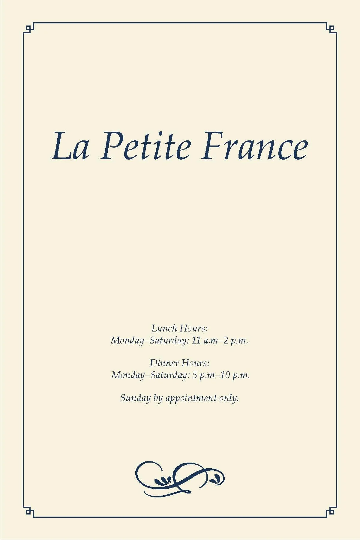 This is a French menu for a restaurant called La Petite France. With the elegant atmosphere this restaurant provides, I wanted to represent that within the menu. I chose to have the color cream and royal blue to emulate the sophisticated look La Petite France was trying to go for. The typefaces I used in the project are Avenir and Palatino.