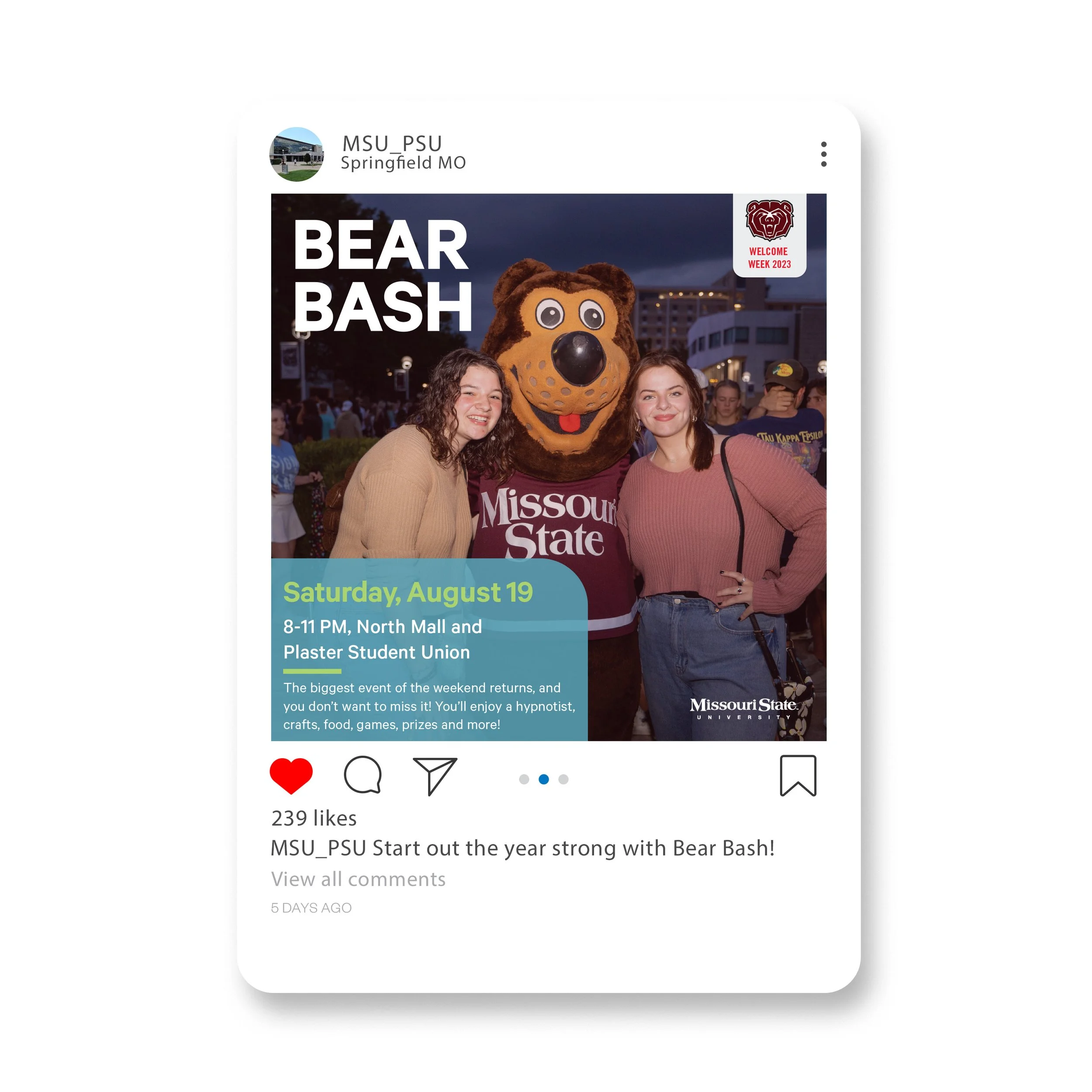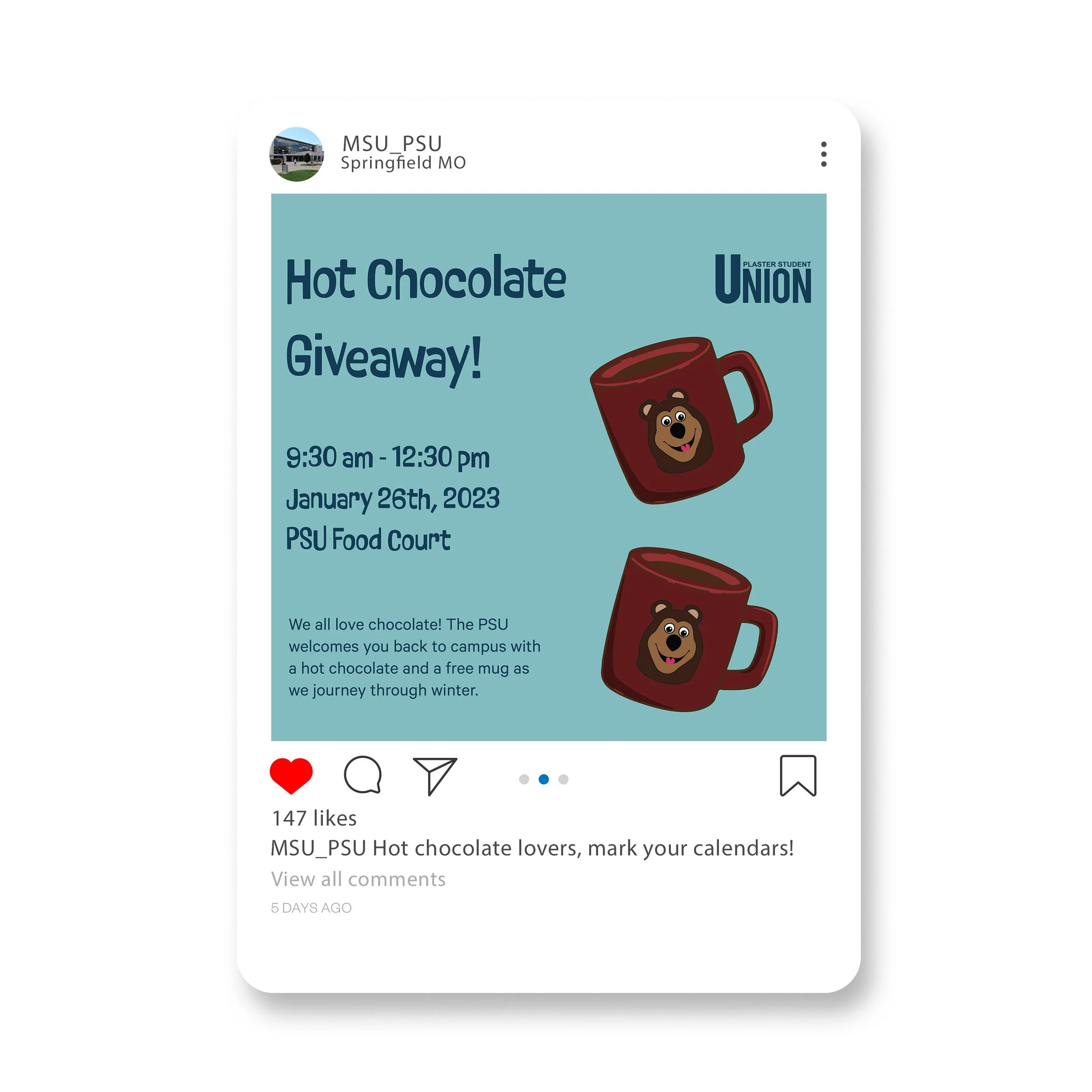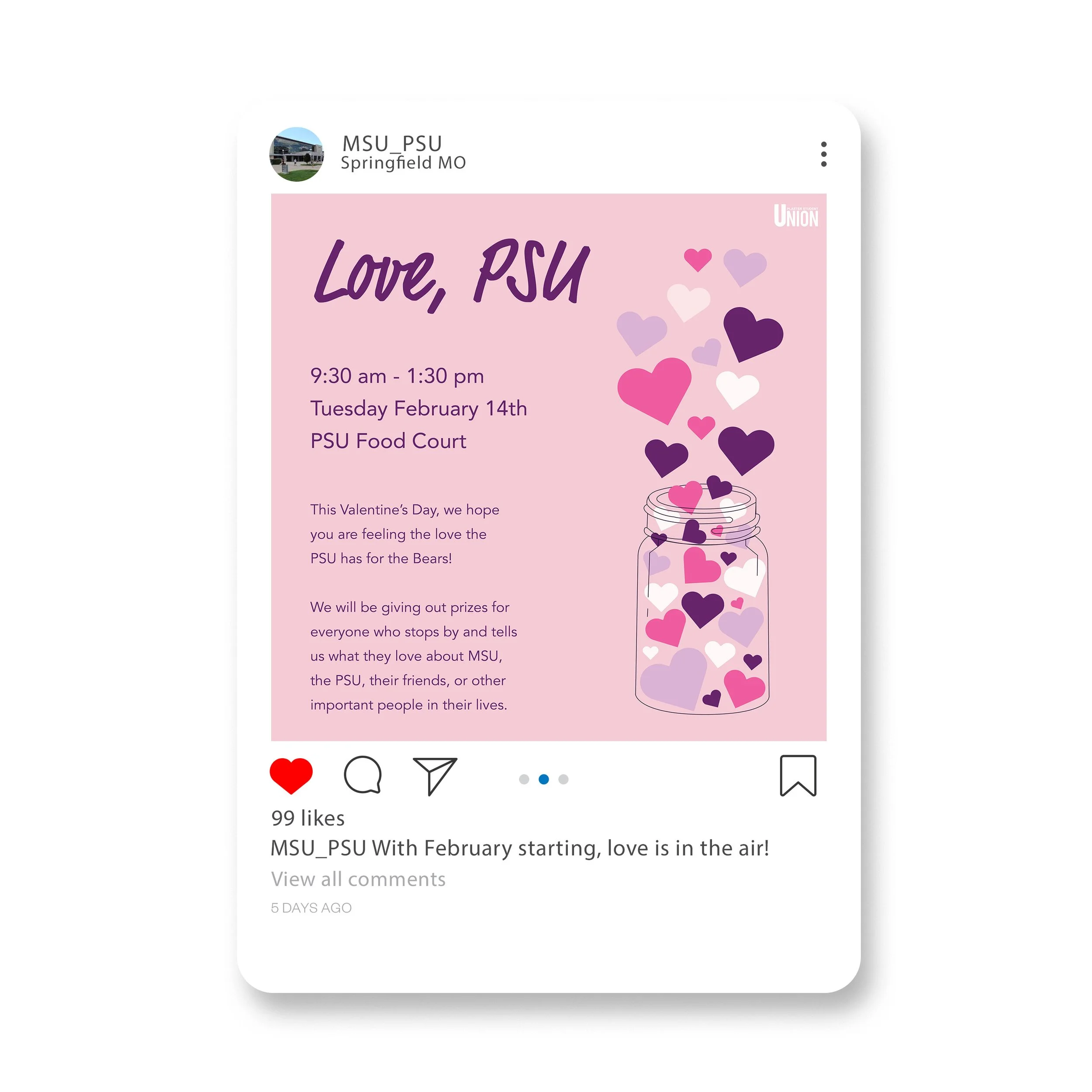 While working at the Plaster Student Union at Missouri State University, I created social media graphics for advertising events held on campus. We did about two to three events per month depending on the season. This was a great way to have the student body enjoy themselves after classes and create a safe fun environment for friends to meet up and hang out. These are only a few posts on social media during my time.