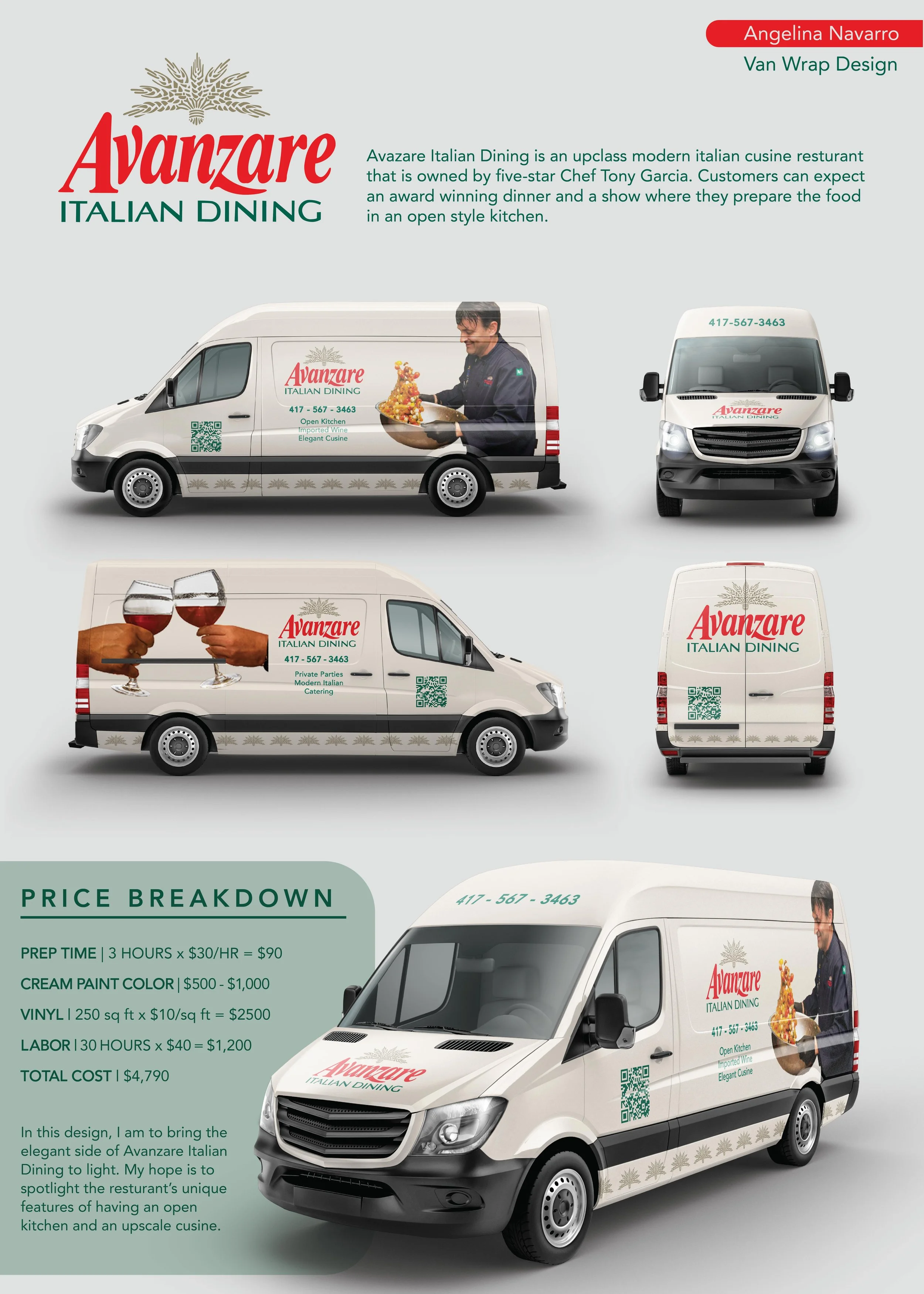 My client is an up-class Italian restaurant located in Springfield, Missouri. One thing unique about Avanzare is that they have an open kitchen in the restaurant where customers can watch the chef at work cook their food. I wanted to highlight the open kitchen feature and their wine imported from Italy. This project was very educational. I learned a lot about the labor and cost of van wraps. I gave an estimated total of the cost to my client so they can decide if this design is best for them and within the price point. I enjoyed the process of creating this design.